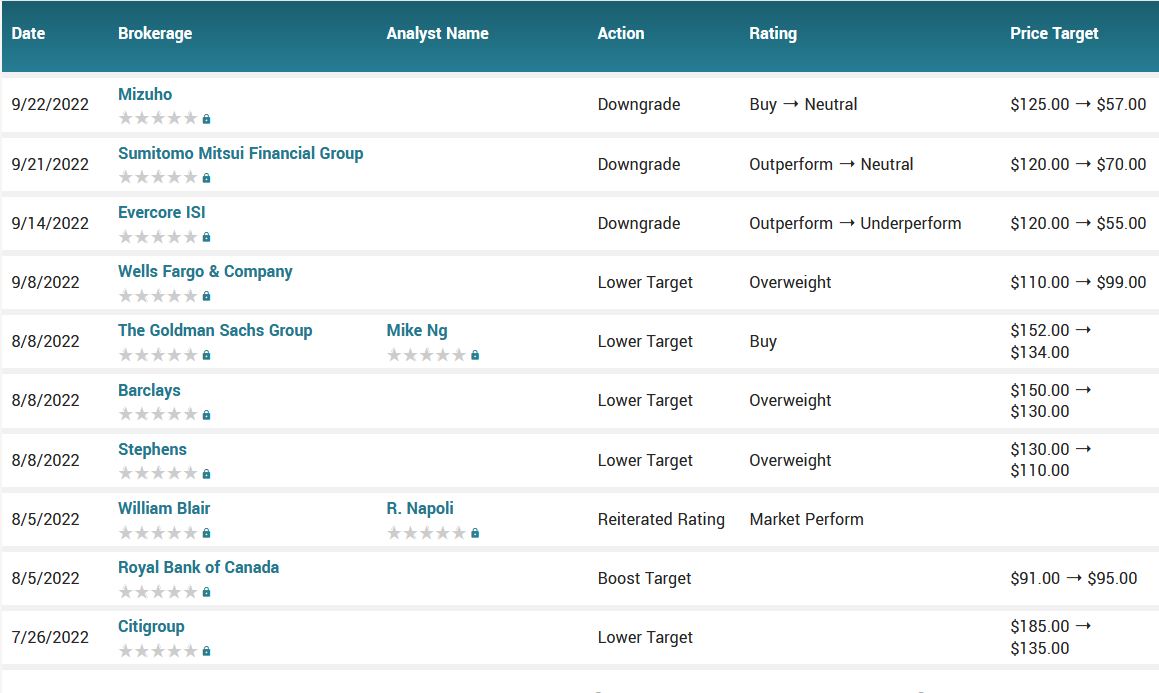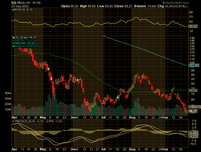 At Mizuho Securities, analyst Dan Dolev downgraded Block stock on Sept. 22 to neutral. They now have a $57.00 price target on the stock, down previously from $125.00.