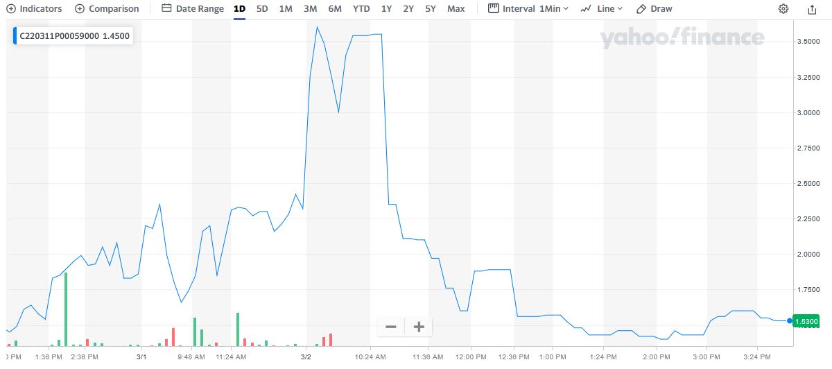 Weekly Options USA Members entered this trade on Tuesday, March 01, 2022 for approximately $1.66; and on Wednesday the price of the option hit 3.60.