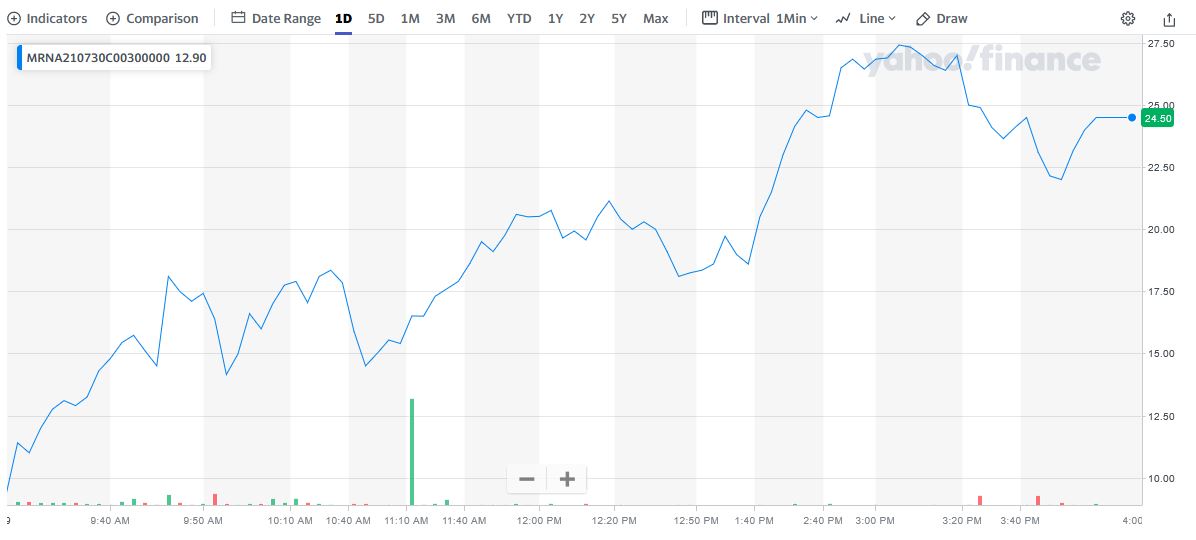 By 3:15pm the Moderna Weekly Options trade had reached a high of $27.55 – up 150% - an increase of $1,655 within the trading day.