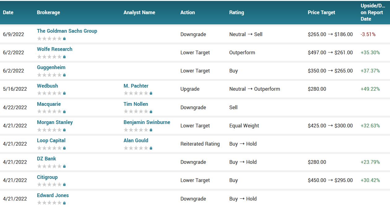 Goldman downgraded the stock to "sell" from "neutral" and slashed its price target to $186 from $265, the lowest PT among analysts covering the stock, according to data from Refinitiv.