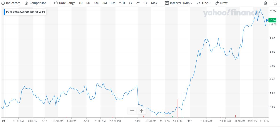 Weekly Options USA Members entered this trade on Tuesday, January 18, 2022 for approximately $4.20 – less than the $4.20 suggested – but due to the market volatility experienced in the recent period of time, the price of the option has moved up and down, but usually in a positive direction that we required.