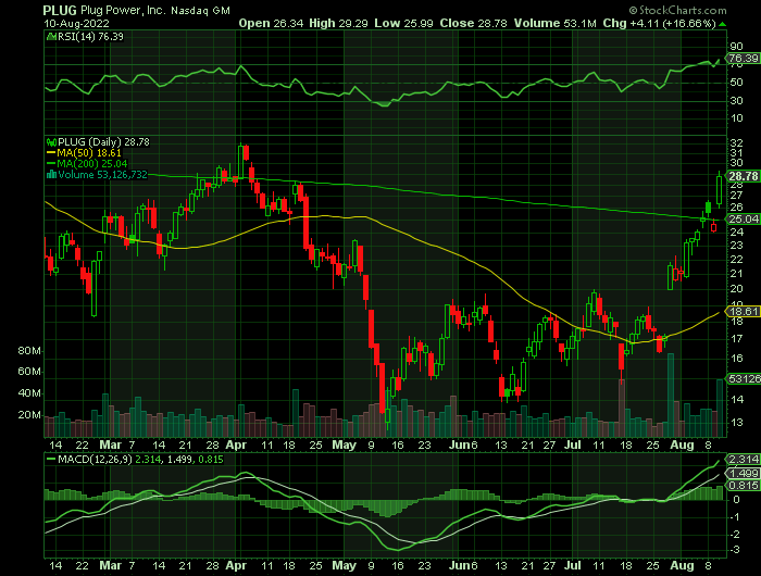 Plug Power Inc stock soared yesterday, surging a whopping 18.7% at its highest point. PLUG closed the day at $28.78 – up 16.66%. The latest earnings report and the Senate passing the Inflation Reduction Act, added to the positive catalysts.