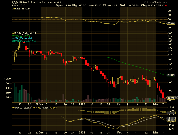 Rivian, the Amazon- and Ford-backed electric vehicle firm went public in November as the sixth-largest IPO in U.S. history and the largest of last year. Shares have since fallen by more than 50% for the year-to-date, however, amid a broad rotation out of growth and technology stocks.