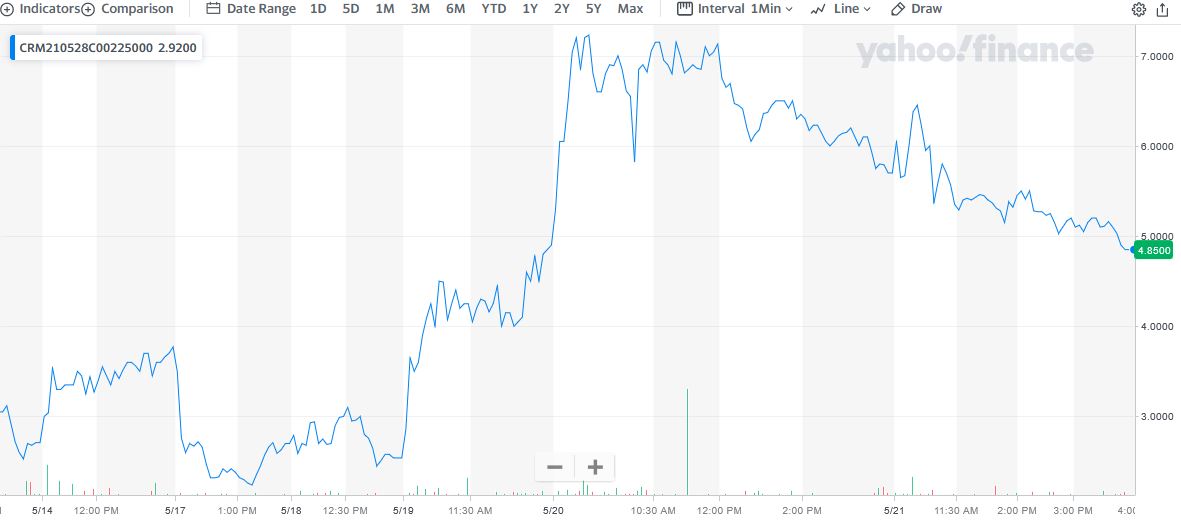** Salesforce Weekly Options Call 2: Buy CRM MAY 28 2021 225.000 CALLS at approximately $5.00.