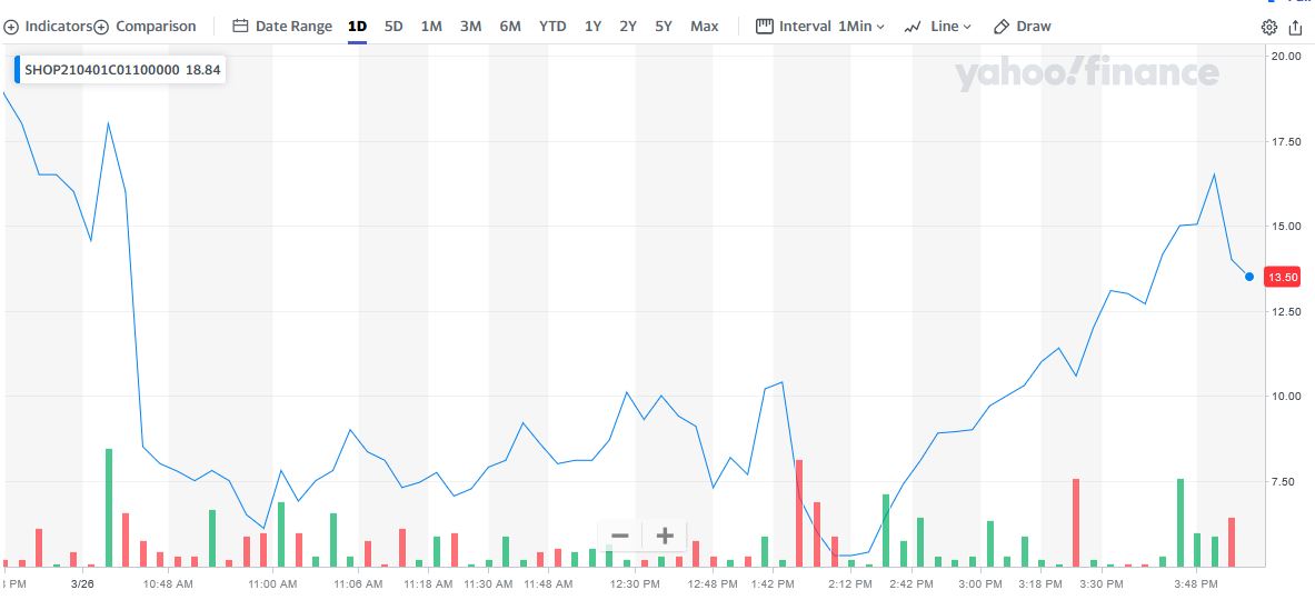1. “Weekly Options Members” entered a trade on Shopify Friday, March26, 2021 for $14.56, at market opening.