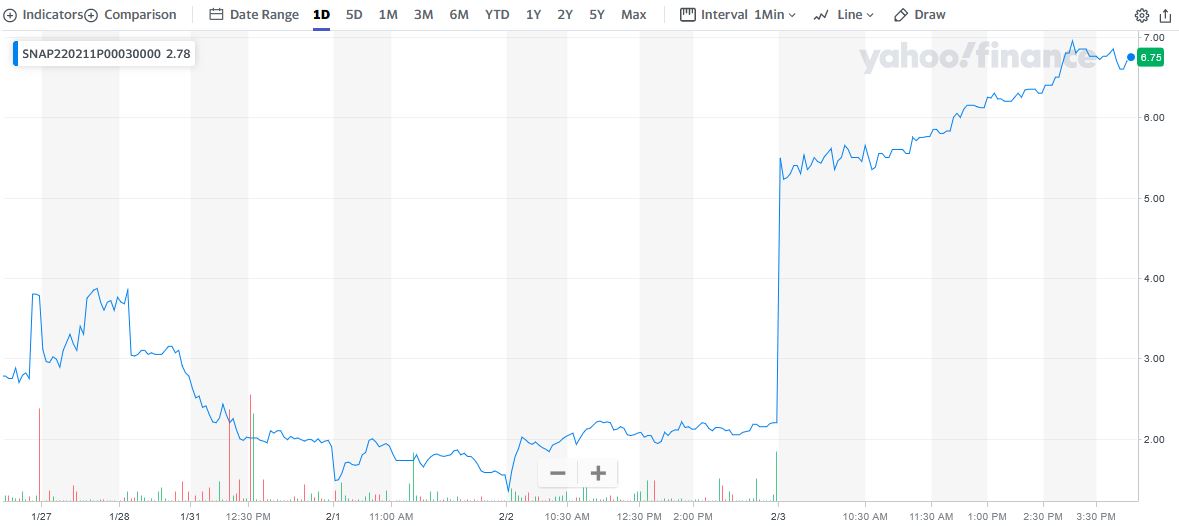 In other words, 1 SNAP option contract would have returned 474% potential profit for an outlay of $221.