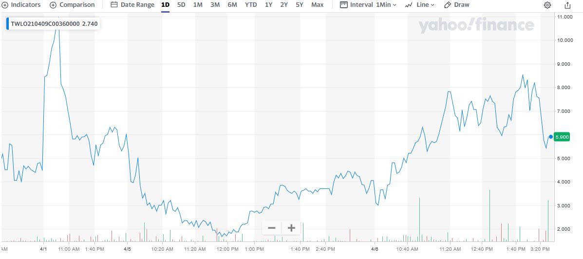 Weekly Options Members” entered a Twilio trade on Monday, April 05, 2021 for $1.67 at 11:57am.