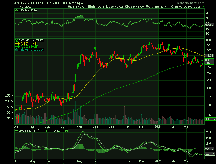 However, AMD stock hit a 52-week high in January this year, but the price for this high-flying chipmaker has pulled back over 20% since then thanks to a variety of factors such as the broader sell-off in tech stocks and rival Intel's (NASDAQ:INTC) resurgence under new leadership.