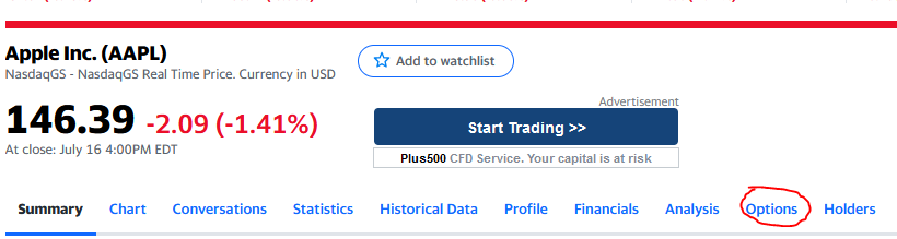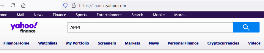 Let's take an example. Today is July 19, and I am planning to buy a weekly option on APPL so I want to check on the range of available dates. The first thing I do is go to Yahoo Finance and type APPL into the search bar.
