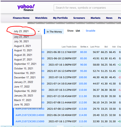 This list of dates shows the next expiration date for this option first, followed by the subsequent dates. By looking at this information I can see that there is an Apple weekly option available for this Friday, July 23. It is the fourth Friday of the month, which means that it is a weekly expiration option, as the monthly option for July expired the previous Friday, July 16.