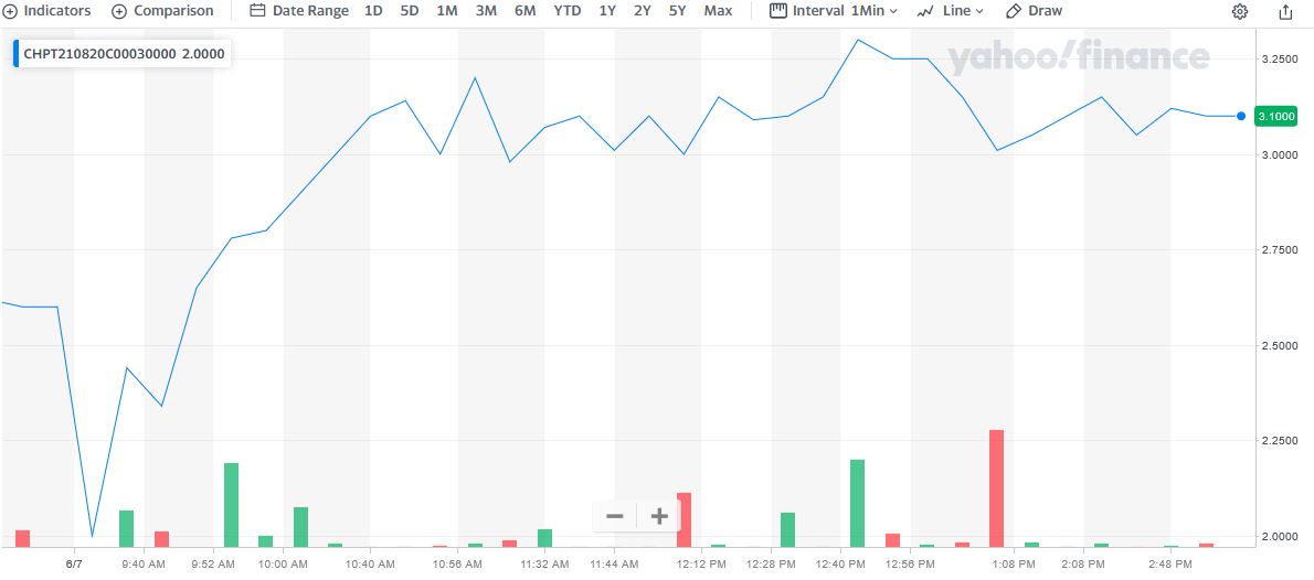 ** OPTION TRADE: Buy CHPT AUG 20 2021 30.000 CALLS at approximately $2.60. (Max. $3.00)